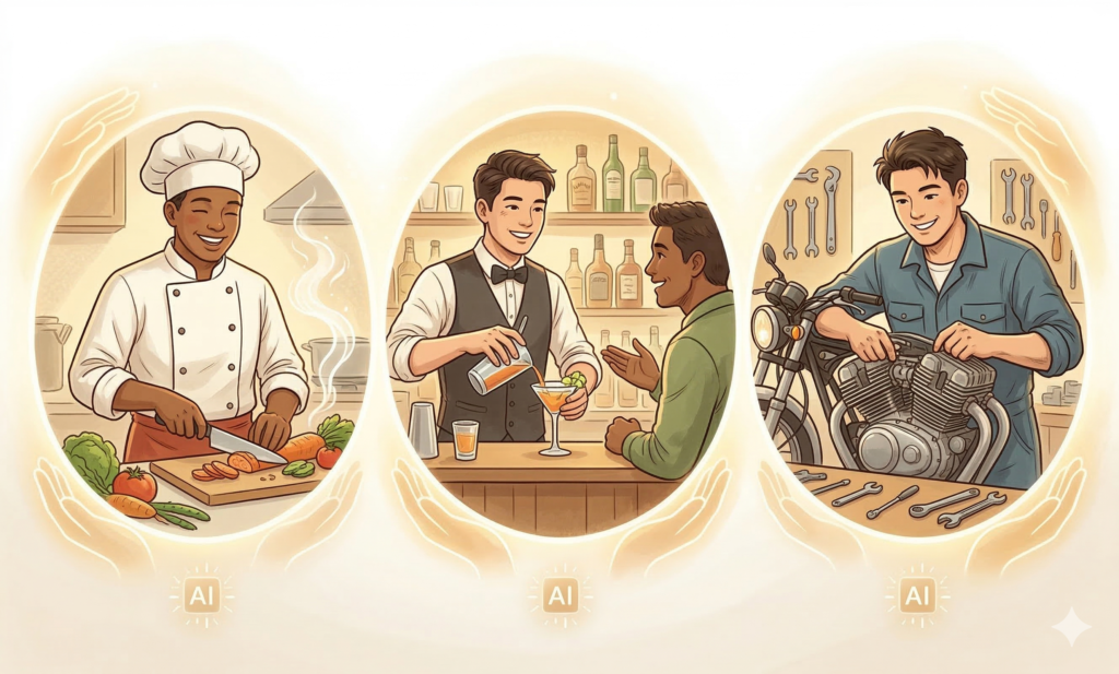 つまり、現場で体を動かし、人と直接関わる仕事全般が、AIの影響を受けにくいのです。