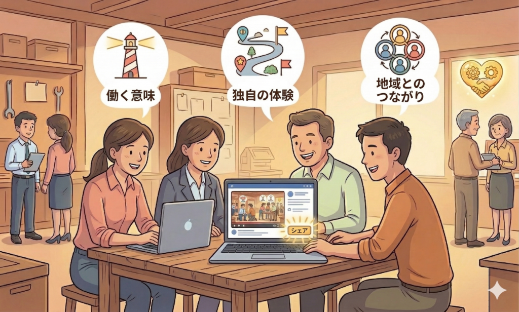 大企業が「AIスキル」「即戦力」「高年収」を打ち出す中で、中小企業が勝負できる土俵は「ここでしか得られない体験」です。